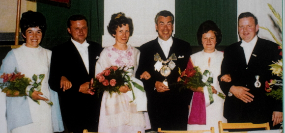 Sein Treffer aber war nicht unbedingt ein glücklicher- zumindest nicht für den Festwirt. Denn der Vogel fiel bereits gegen 13.30 Uhr nach dem achten Schuss. Von Spannung an der Vogelstange konnte in diesem Jahr also keine Rede sein. Viele Zaungäste kamen auch zu spät zur Vogelstange an der Erler Chaussee, wie sie damals noch hieß. Schulze selber wusste nicht wie ihm geschah, erzählt er rückblickend, aber erfreut sei er trotzdem gewesen. Auch seine Königin Irmgard Hater war sehr überrascht, sie stand in der Küche als sie die Nachricht erhielt. „Das war abgesprochen, dass ich Königin werde, wenn er den Vogel herunterholt“, berichtete die Goldkönigin am Sonntag. Ehrenpaare wurden Kurt Baumeister und Gertrud Schulze, sowie Richard Hater und Gertrud Baumeister. „Wir hatten ein tolles und ausgelassenes Jahr“ erinnern sich beide.