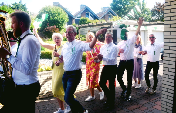 Dass die Kutschfahrt am Sonntag und die Feierlichkeiten im Festzelt ausfielen, war angesichts einer ganz anderen Kiliansfeier, nämlich eine im familiären Rahmen mit Besuch des aktuellen Thrones um König Bernd Becker und Königin Ulla Bienbeck, sowie dem Silberkönigspaar Sandra und Kilian Zens gar nicht schlimm. Momente der Rührung kamen bei dem Jubiäumspaar auf, als die Vortrommlertruppe im Garten aufmarschierte und einige Blasmusikstücke spielte. „Schöner hätte es gar nicht sein können“ resümierte Präsident Gregor Zens, der mit seinem Vizepräsidenten Stefan Fasselt ebenfalls zu Gast war.