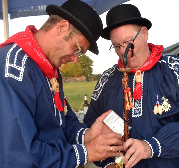 Ja und dann sollte nach dem langen Erzählen endlich mal die Piepe brennen. Denn Tabak hatte König Bernd extra aus dem Norden mitgebracht. Fruchtig roch er, was bei allen gut ankam. Die Pfeifen wurden gestopft- tja und dann wollte zunächst keine brennen. „Ohne Königin geht datt nicht“, wurde humorvoll geschimpft, denn man muss wissen, dass es die jeweiligen Königinnen sind, die zur Parade auf dem Festplatz die Pfeife vorbereiten. Die Damen haben offensichtlich das richtige Händchen fürs stopfen, denn beim Festakt brennt diese sofort.