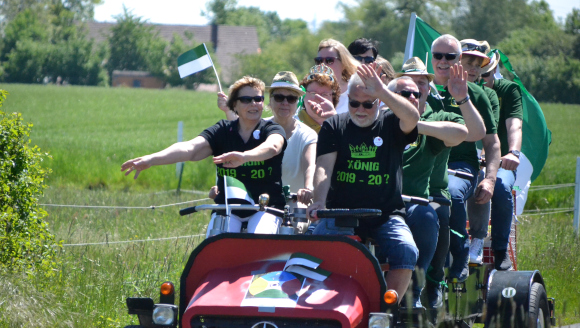 Im letzten Jahr haben sich die Thronpaare Ulla Schulte, Gerd Pleines, Silke Terhart und Dietmar Sadlo mit ihrem Königpaar Königin Anke Rohe und König Ingo Wengel via Cabrio auf eine Tour durchs Königreich gemacht. Das wiederholten sie in diesem Jahr. In ähnlicher Weise. Übrigens: Silke Terhart und Dietmar Sadlo wären in diesem Jahr das Silberkönigspaar gewesen.