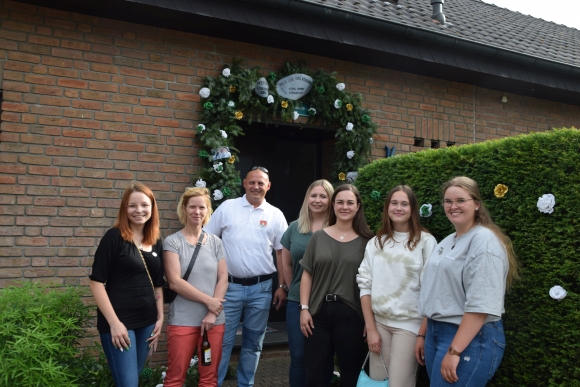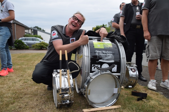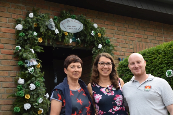 7.7.2022 Schermbeck (geg). Die Vorbereitungen fürs Traditionsfest laufen auf Hochtouren. Dem Königspaar einen Kranz zu binden gehört ebenfalls zu den Festaktivitäten. In der Schermbecker Gilde erhält das Königspaar im jährlichen Wechsel einen Kranz. In diesem Jahr war Königin Lenja Niesen an der Reihe. Da diese Reiterin ist, fühlten sich die Reitermädels samt Kompaniechef Michael Matuszczak bewogen, den Kranz und die Röschen zu binden. Da die Königinmutter Doris Hecheltjen-Niesen in diesem Jahr Goldkönigin ist, wurden auch einige goldenen Röschen am Kranz angebracht. Ein Ständchen brachte auch die Trommlergruppe, diesmal mit spontaner Verstärkung aus dem Tambourcorps Schermbeck.