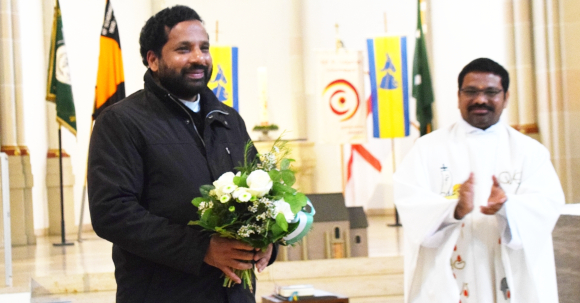 Zu Gast war an diesem Tag auch der Vorgänger von Pastor Xavier- Pater Anthony nämlich. Auch dieser feierte in den letzten Wochen sein silbernes Preisterjubiläum bei dem einige Schermbecker zu Gast waren. Pater Anthony erhielt einen nachträglichen herzlichen Glückwunsch und einen Blumenstrauß.