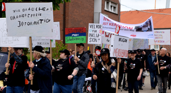 Mit eigens gestalteten Transparenten machten die Haus Kilianer auf die Rechte von Menschen mit Behinderung aufmerksam.