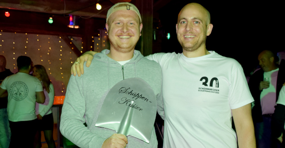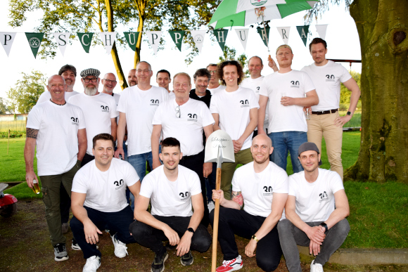Das jährliche Schüppenwerfen tragen die Männer ein jedes Mal unter sich aus- keine Öffentlichkeit und keine Frauen. Beim Jubiläum war das anders. Präsident Thomas Heiermann erinnerte in seiner Begrüßung an die Anfänge der Gruppe in der Kiliansgilde. „Damals hatten die Gründungsmitglieder beim Kiliansfest früh morgens auf dem Nachhauseweg eine Bauschüppe entdeckt und den ersten Wettkampf veranstaltet“, so die absolute Kurzfassung der Geschichte von Heiermann. Erster Schüppenkönig war damals Andreas Janßen. Denn eigentlich, so berichteten die Mänenr der ersten Stunde Ralf Horstkamp Tasso Stiebels, ist der erste Schüppenwurf schon 36 Jahre her, der dann vor 30 Jahren zur Infitialzündung der Vereinsgründung wurde. So ganz waren sie sich zum Ablauf nicht einig- schließlich war es schon spät und dunkel. Aber Fakt ist wohl, dass es ein Dienstagmorgen um fünf Uhr (oder war es doch schon acht Uhr?) war, an dem die Männer in feuchtfröhlicher Stimmung ihr Zuhause ansteuerten. Irgendwo haben sie dann noch Bier gekauft und Tasso musste mal "für kleine Jungs im Gebüsch verschwinden". Dort habe er dann an einer Baugrube die Schüppe entdeckt und auf einer Wiese am Bösenberg weit von sich geschmissen. Der Wettbewerb war geboren. Ralf Horstkamp fügte an, dass es für die Jugend damals "nichts gab", so dass diese sich entschlossen den Anlass des Schüppenwerfens zum regelmäßigen Ritual werden zu lassen. Zum Schützenfest natürlich und zack wurde ein Verein gegründet, als sich dieser Idee viele junge Mänenr begeistert anschlossen.