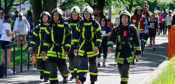 "Ich habe mich sehr gefreut, dass insgesamt 21 Kameradinnen und Kameraden aus den Löschzügen Altstadt, Holsterhausen und Hervest-Dorf den Lauf unterstützt haben. Allen gilt mein großer Dank für die großartige Repräsentation unserer Feuerwehr", sagt Andreas Fischer, Leiter der Feuerwehr. Mehrere Mitglieder aus den Löschzügen sind dabei nicht nur mit einem Feuerwehr-T-Shirt präsent gewesen, sondern auch durch ihre Schutzausrüstung. Jacke, Hose, Schuhe und Helm bringen einige Kilo Zusatzgewicht und lassen die Kameraden noch einmal mehr Schwitzen. Dazu durfte natürlich auch die Druckluftflasche aus Stahl mit Atemluft auf dem Rücken nicht fehlen.