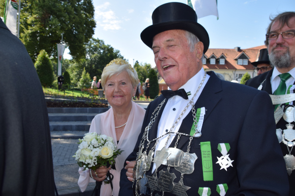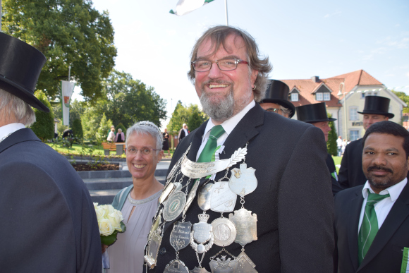 Wie Sie sehen ist der größere Platz, den wir hier haben, in diesem Jahr auch dringend nötig gewesen. Neben unserem Königspaar Andreas Mohr und Petra Höper mit Ehrendamen und Ehrenherren darf ich besonders unser Silberkönigspaar Andreas Pieniak und Birgit Timmermann sowie unser Goldkönigspaar Hubert Timmermann und Monika Kretschmann herzlich begrüssen. Unsere diamantene Königin Hildegard Schmeing ehren wir heute Nachmittag am Altenheim. Eine grosse Freude ist es, unsere eiserne Königin Luzia Renk von Anfang an dabei zu haben. Vor wenigen Wochen haben wir unsere Kronjuwelen Königin Elisabeth Stein besucht. Elisabeth Stein ist unsere 1. Königin nach dem 2. Weltkrieg, Königin von 1949. Es war schon sehr besonders und erfrischend zugleich, wie euphorisch Sie von damals berichtet hatte, als wär es erst wenige Jahre her. Leider ist sie aus gesundheitlichen Gründen heute nicht dabei, sie lässt aber herzliche Grüße ausrichten. Unser diamantener König Franz Hegemann, unser eiserner König, Hermann Berger, unser Kronjuwelen König Ernst Grüter können den Tag nicht mehr mit uns erleben, in Gedanken sind sie aber bei uns.