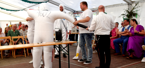 Auch am Montag standen im Mittelpunkt der Veranstaltung wieder die humorigen Bestrafungen für Verfehlungen in den Reihen der Schützen, die diese sicherlich nicht so schnell vergessen werden. Viel Wasser war dabei im Spiel und so mancher Schütze und auch Besucher ging pitschnass nach Hause