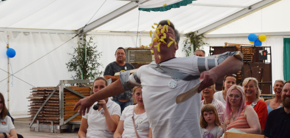 Wie herausfordernd die Nahrungsaufnahmen während des Schützenfestes sind, zeigte Schüppe Timo Strenger. Dieser hat versucht Pommes zu essen- in der einen Hand hielt er die Schüppe und in der anderen die Pommesschale. Das Essen ging natürlich schief. Drei Portionen später soll er es geschafft haben, berichtete Micki Niessing, der die Veranstaltung moderierte. Leider war Strenger selbst nicht da, so dass es schwierig war, das nachzustellen. Für ihn eingesprungen ist Thomas Schering.