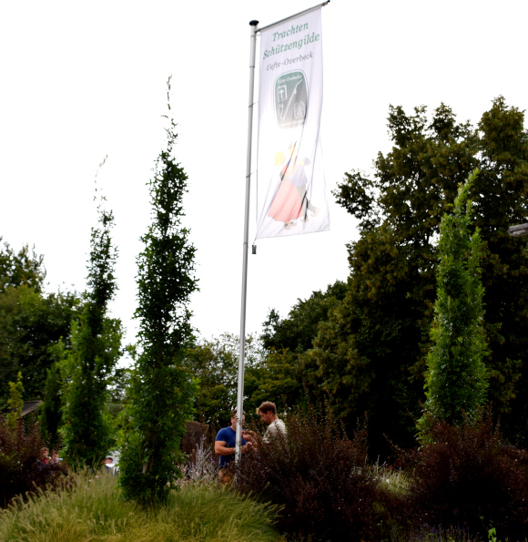 Als erste "Amtshandlung" zogen sie die Uefter-Overbecker Fahne am Kreisverkehr hoch und marschierten dann nach eins zwei Ständchen weiter zum Oberst Michael Dahlhaus, der am Heggenkamp wohnt. Marius Sühling betont: "Der Oberst benötigt natürlich auch eine Fahne." Von dort ließen sich die Musiker nach Hinteruefte kutschieren, um dort, unter anderem auch bei der Königin Sabrina Ribbekamp die schicke Fahne hochzuspielen. Hocherfreut zeigen sich die Uefter und hoffen, dass daraus eine Tradition entsteht.