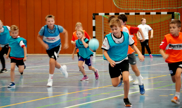 Das Rahmenprogramm war gewohnt sportlich: vormittags konnten die Bambinis und Minis ihr Geschick bei verschiedenen Übungen mit Ball unter Beweis stellen und wurden dafür mit kleinen Süßigkeiten belohnt. Nachmittags spielten ab 12.00 Uhr zunächst die F- und E-Jugendlichen in wild gemischten Mannschaften in einem kleinen Handball-Turnier ihre Sieger aus. Ab 14.00 waren dann die Spieler*innen der D bis A-Jugend an der Reihe. Auch hier wurden die Mannschaften wild gemischt, so dass Klein und Groß und Jungs und Mädchen in einer Mannschaft zusammenkamen. Tore durch D-Jugendliche zählten hierbei 3-fach, durch C-Jugendliche doppelt, und sonst einfach. In spannenden Spielen hatten am Ende alle viel Spaß, und alle Mannschaften erhielten bei der Siegerehrung von Organisator Sven Felisiak eine Dose Leckereien als Belohnung.