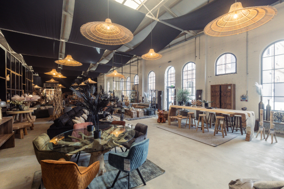 Die Decken sind mit Stoffen abgehängt, riesige Lampen sorgen für ein gedämpftes Licht in dunkleren Bereichen und große Grünpflanzen sorgen für eine Auflockerung der Kompositionen. Das Tüpfelchen auf dem besagten “ i“ sind natürlich die ursprünglichen, teilweise rohen Wände und Fenster die mit ihrem Industriecharakter perfekt zum Style der Möbel passen.