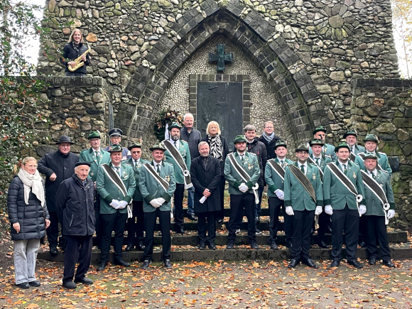 18.11.2024 Schermebck (pd)., Alle Schützenvereine legten am Sonntag an ihren Ehrenmalen in einer kleinen Feierstunde einen Kranz nieder und gedachten der Vermissten und Verstorbenen der Weltkriege.