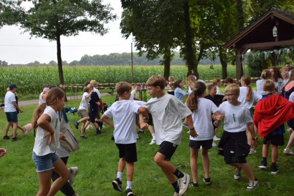 Die Ferienspiele, die recht kurzfristig auf die Beine gestellt wurden, laufen in dieser Woche. Dafür wurden die besten Programmpunkte aus den Ferienlagern zusammengestellt, wozu auch das Schützenfest gehört. Zu Besuch kam vor dem Beginn des Königschießens das Königspaar der Uefter Trachtenschützengilde Bernd Klevermann und Sabrina Ribbekamp mit den Ehrendamen Claudia Klevermann und Petra Temmler. Alle 54 Kinder im Alter haben einen Morgentanz einstudiert. In diesem Fall war es „Der Spielmann“, der für Begeisterung beim amtierenden Königspaar sorgte. Die passende Melodie spielte Gertrude Knufmann auf dem Akkordeon.